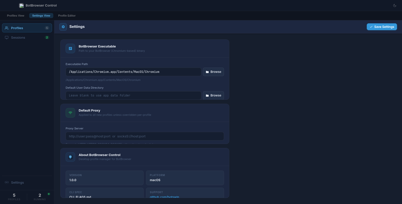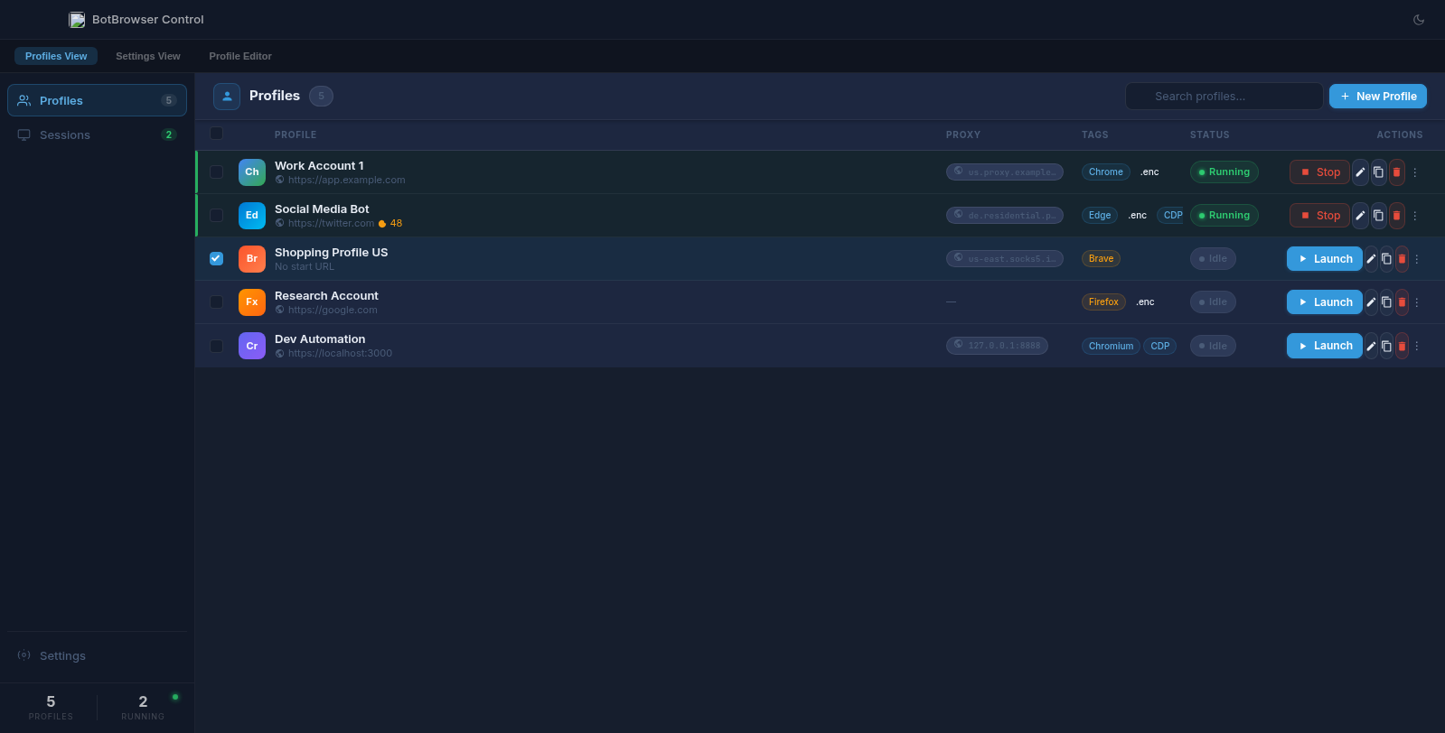 botbrowser-control/folder containing a full Electron desktop app for managing BotBrowser profiles.Screenshots