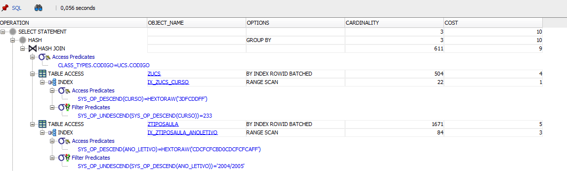 CREATE INDEX IX_ZUCS_CODIGO_CURSO ON ZUCS(codigo, curso);The first one is useful since the tipo column from ZTIPOSAULA is used in the HAVING clause to determine if a course has all types of classes. This makes the HAVING statement have a cost of 13 instead of 37. In spite of this, the total cost of the query won't change with this index.